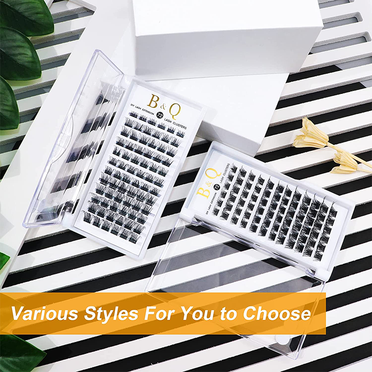 DIY individual clusters at home: 72 clusters in one tray. You can apply cluster lashes at home by yourself. Easy to put lashes on, gorgeous results, and lash clusters are not easily fall apart. Cluters take less time to complete each eye. Now save so much money and time. Great quality: B&Q cluster lashes look real, not plasticky, and reusable with proper care. Easy to take off and these individual eyelashes will not be broken when getting them off the backing with tweezers. The lash clusters extensions last for weeks. Soft, lightweight, vegan, knot-free, and matte dark.